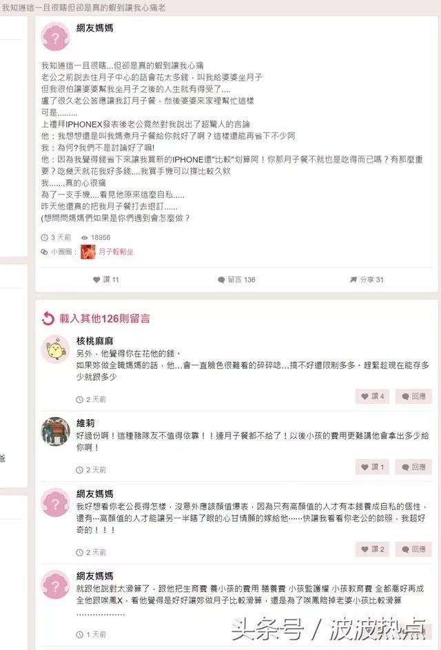 这个贴子也引起网友的广泛讨论「男人就这么自私,这么不会想?」、「我听人家说过坐月子是婚姻的试刀石」、「所以自己要有钱」、「这种老公不要也罢!等他拿到新手机,他只会双手捧着手机,不会理你和小孩的」、「怀孕后才能认清老公。千万不要再生!用月子餐钱买手机只是开始,你老公以后会做很多更扯的事情。」、「这可以直接离婚」、「他爱苹果比爱妳多,其实……他只爱自己,只有嘴巴说爱妳」。 湘潭一网友评论道: 老婆孩子加一起居然比不上一台苹果8,这样的例子在生活中并不少见。当真正走进婚姻中,不少女性才会发现,男人嘴巴上的甜言蜜语并不见得是真爱,爱不是听他说了什么,而是看他做了什么。当碰到这种男人的时候,女性往往处于进退两难的地步,如何才能为自己就解围?软弱不是,反抗更不是!