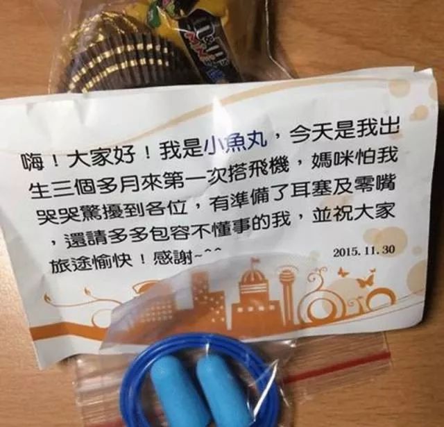 带着出生不久的宝宝坐飞机 担心宝宝哭闹吵到其他乘客 一名贴心的妈妈 准备了好几副耳塞和零食供机上乘客 并附上纸条表示 “妈咪怕我哭哭惊扰到大家, 还请多多包容不懂事的我” 拿到这份贴心的礼物 大家既快乐又感动