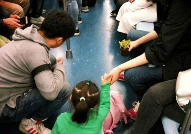 不要小瞧这个弯腰蹲在地上的小举动 因为,越重要的东西往往越简单 同样在地铁里 孩子把爆米花洒了一车厢 父母跟孩子一起 一粒一粒地捡起