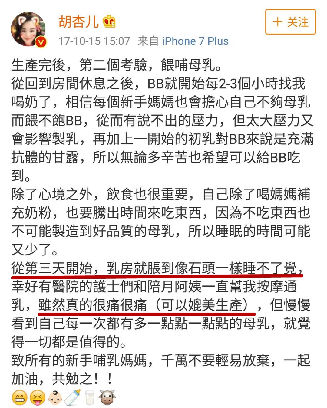 (演员胡杏儿就在网上分享了开奶的痛苦)