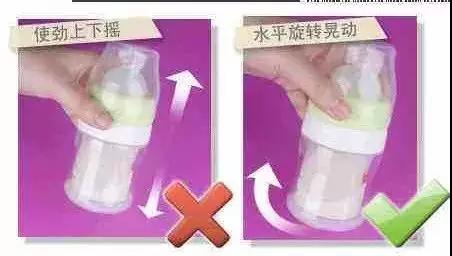 正确做法是这样的:手握奶瓶中上部,沿同一方向摇晃瓶底,使在水平面上旋转。速度不宜太快,不产生气泡为宜。若产生气泡,应静置等气泡消失才给宝宝饮用。