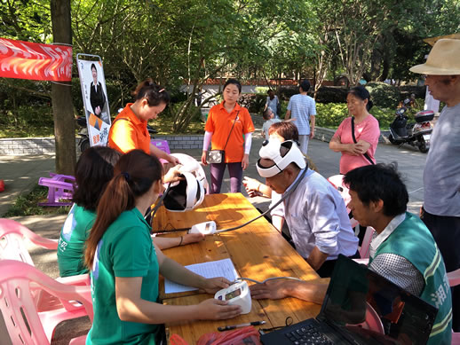 公司养老中心的同事认真为老人测量血压,耐心细致地答疑解惑