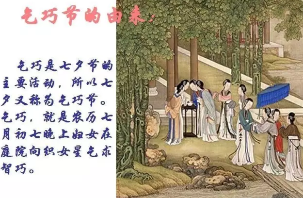大河之东,有美女丽人,乃天帝之子,机杼女工,年年劳役,织成云雾绢缣之衣,辛苦殊无欢悦,容貌不暇整理,天帝怜其独处,嫁与河西牵牛为妻,自此即废织紝之功,贪欢不归。帝怒,责归河东,一年一度相会。”关于牛郎织女最早的记载,见于南北朝任昉所著的《述异记》。 在中国古代,七夕与爱情无关。七夕节又叫做乞巧节,乞巧节,顾名思义就是家里的姑娘向织女乞求心灵手巧。乞巧的方式,不同地区各有不同。穿针引线,小物品竞巧是最常见的乞巧方式,也是最早有记载的。《西京杂记》说:“汉彩女常以七月七日穿七孔针于开襟楼,人具习之。”