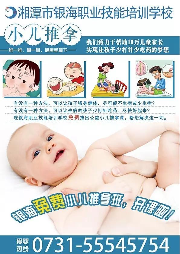 孩子病了,不愿意打针,不愿意吃药,又哭又闹,做爸妈的既心疼又无奈,该如何是好呢?小儿推拿,为你解忧,推一推,疾病全推掉,拿一拿,健康都拿来。湘潭市银海职业技能培训学校免费推出公益小儿推拿课,致力于帮助10万儿童家长实现无药物健康疗法的梦想。 为保证让每个学员学到真本领,掌握真技能,银海培训学校的高级理疗师、高级保健按摩师、小儿推拿师毛碧伦老师将全程手把手指导。 报名截止:2018年3月9日止 开课时间:3月10日9点—11点 报名方式: 1、电话: 15200328200(微信同号) 2、微信报名:扫一扫立即报名